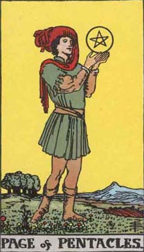 He rides a slow but steady horse, which is just like him. He holds the pentacle, but does not look therein.